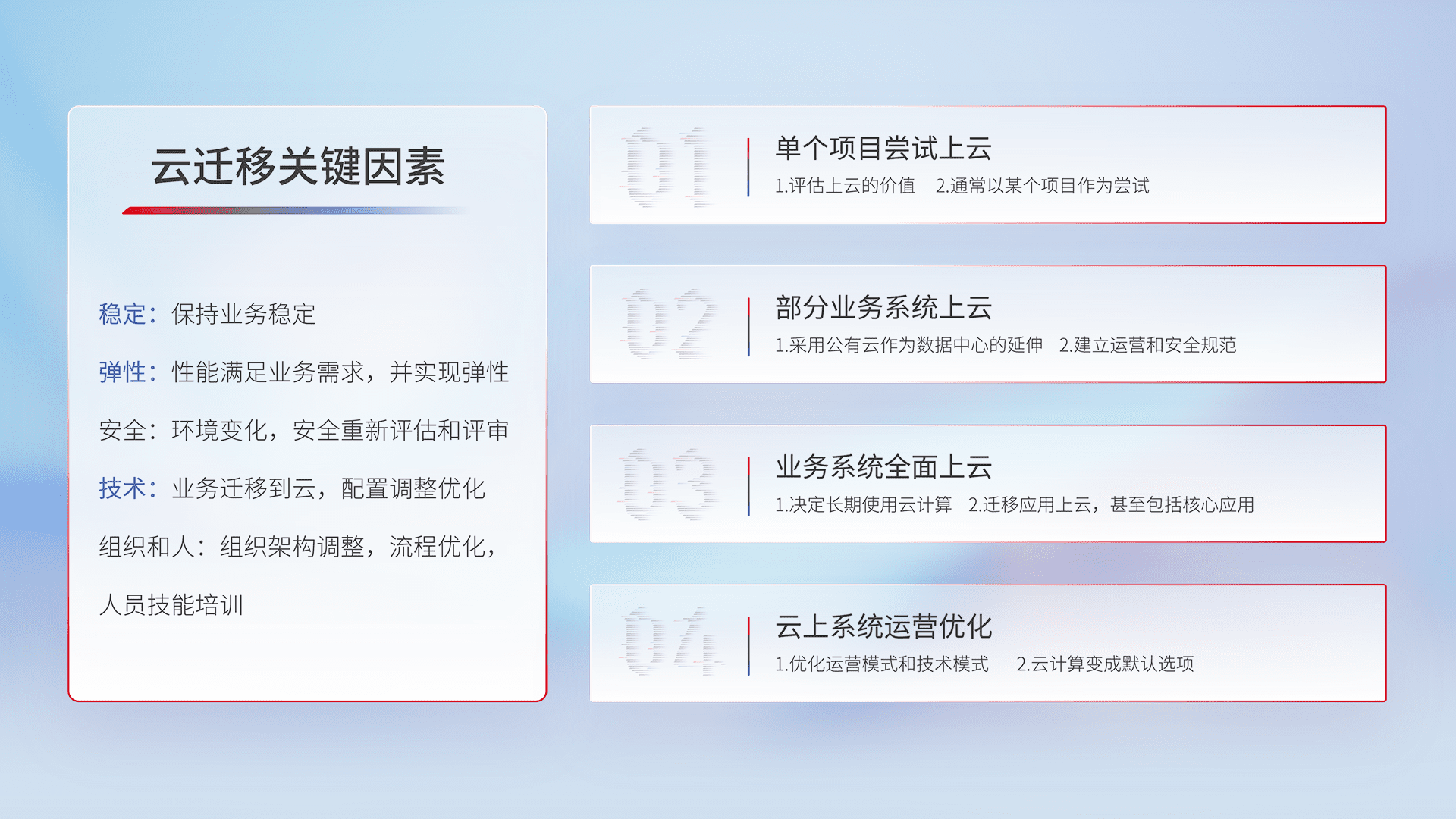 结合实际业务,,,从规划设计、、、云平台选型、、云原生改造、、数据迁移、、集成交付,,,迁移全过程为客户识别最佳上云路径,,,做好风险识别管理,,,设计网络架构、、、、身份权限、、、、安全审计合规、、、操作审计、、日志审计、、、、监控告警策略、、多站点容灾设计等,,对云上基础设施进行整体规划,,,提升IT治理水平,,以满足弹性、、高可用、、、、高性能的需求。。。